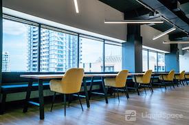 Gorgeous open-concept desk area with city skyline views. Membership allows access to phone booths, boardrooms, and other communal spaces.